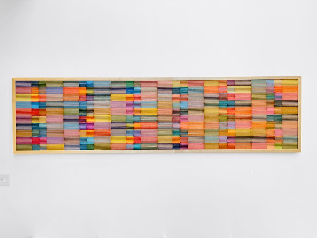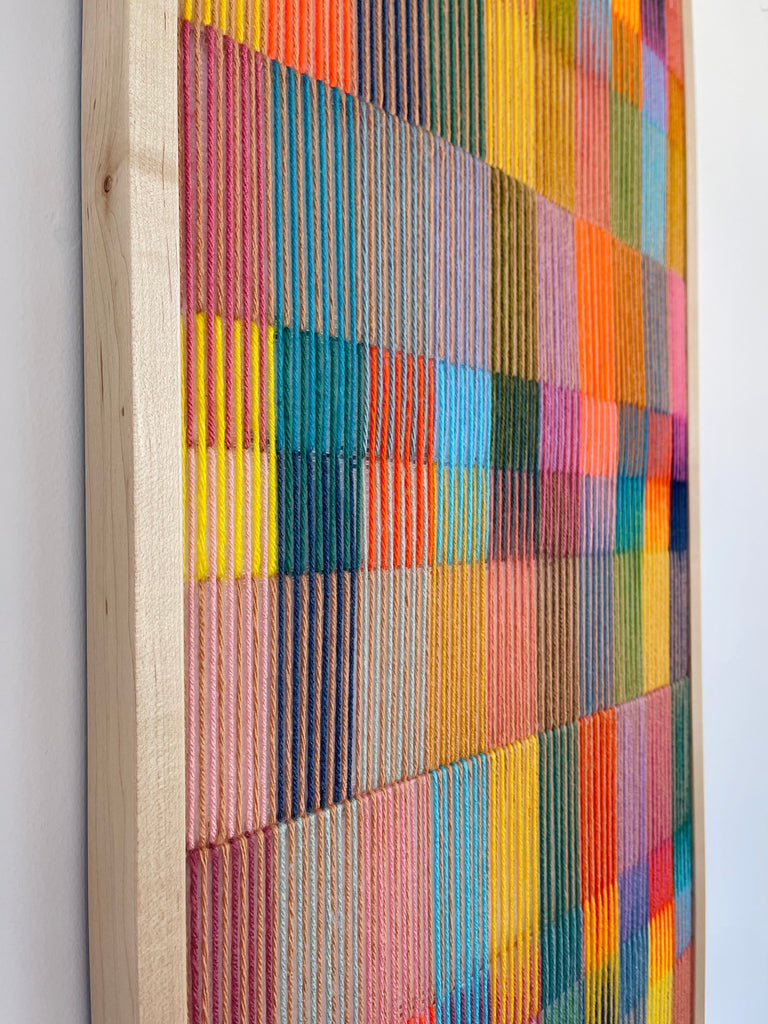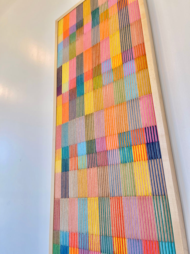 This artwork features colorful lines made of soft yarn, which creates a delicate yet vibrant pattern.