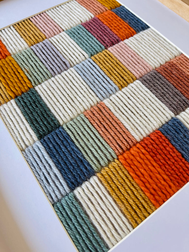 This is a handmade textile artwork made with wool and acrylic yarn. It's framed and ready to hang.