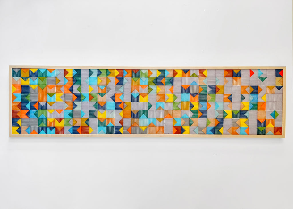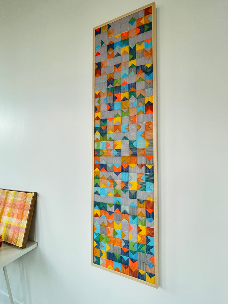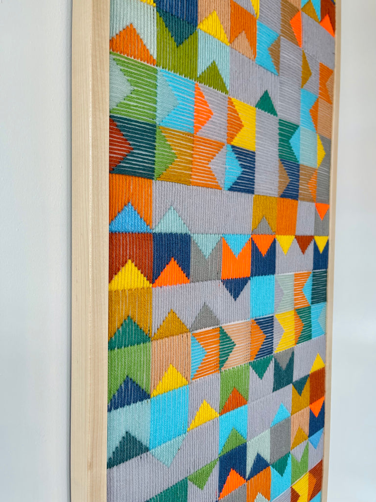 This artwork was inspired by my favorite Brazilian artist, Alfredo Volpi. It features triangles and squares made of soft yarn, which creates a delicate yet vibrant pattern.