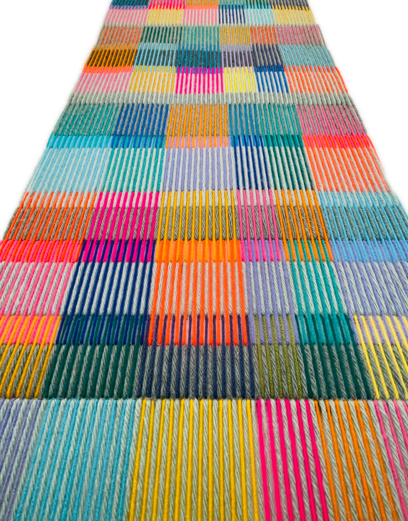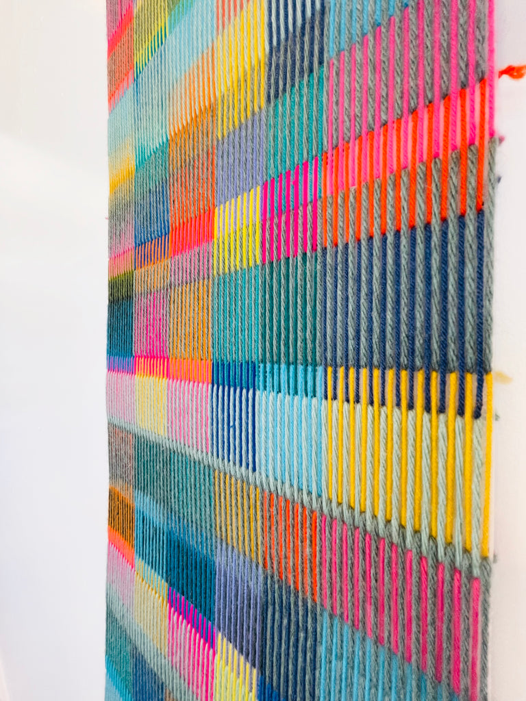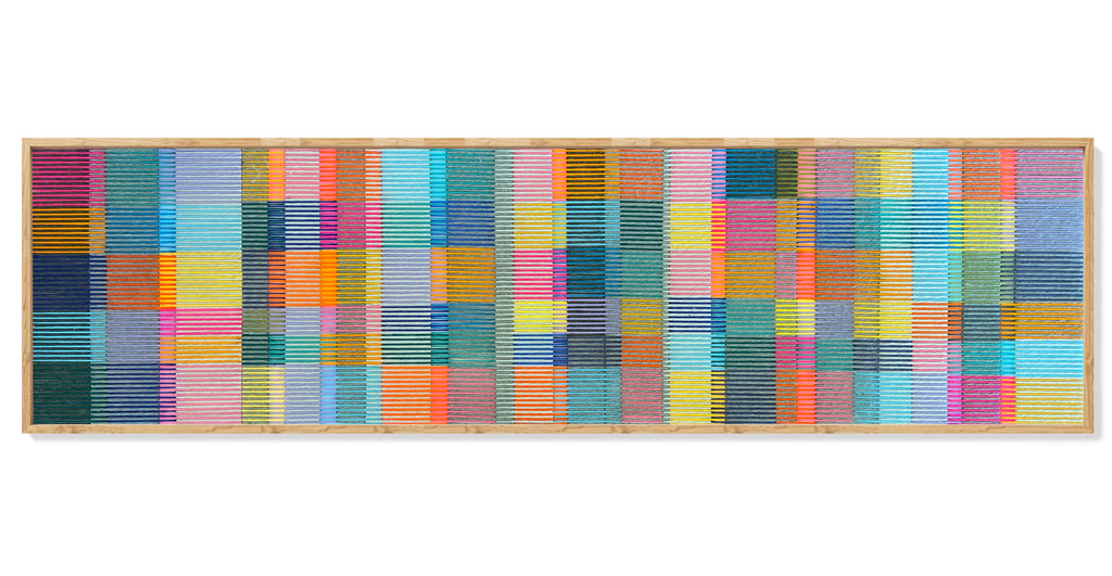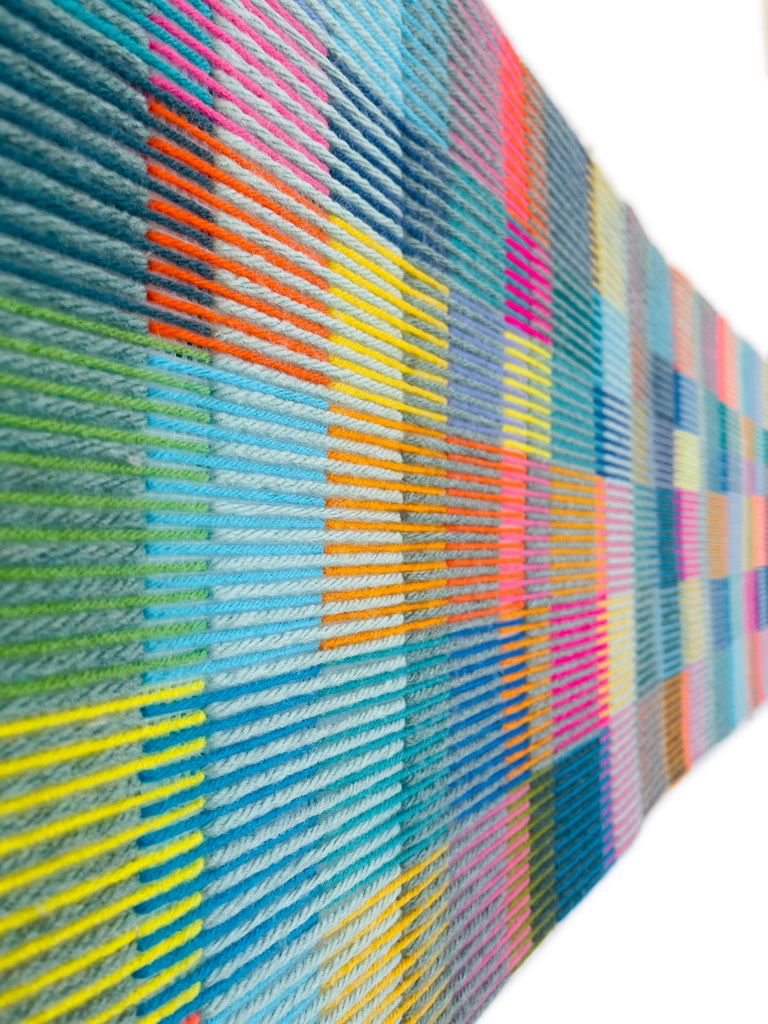 This artwork features colorful lines made of soft yarn, which creates a delicate yet vibrant pattern.