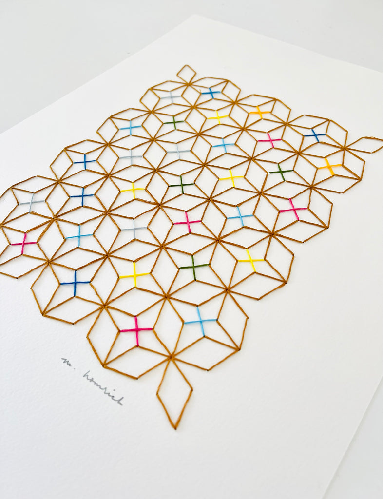 This delicate artwork is stitched by hand with cotton threads that bring tactility and softness to a composition rooted in structure.